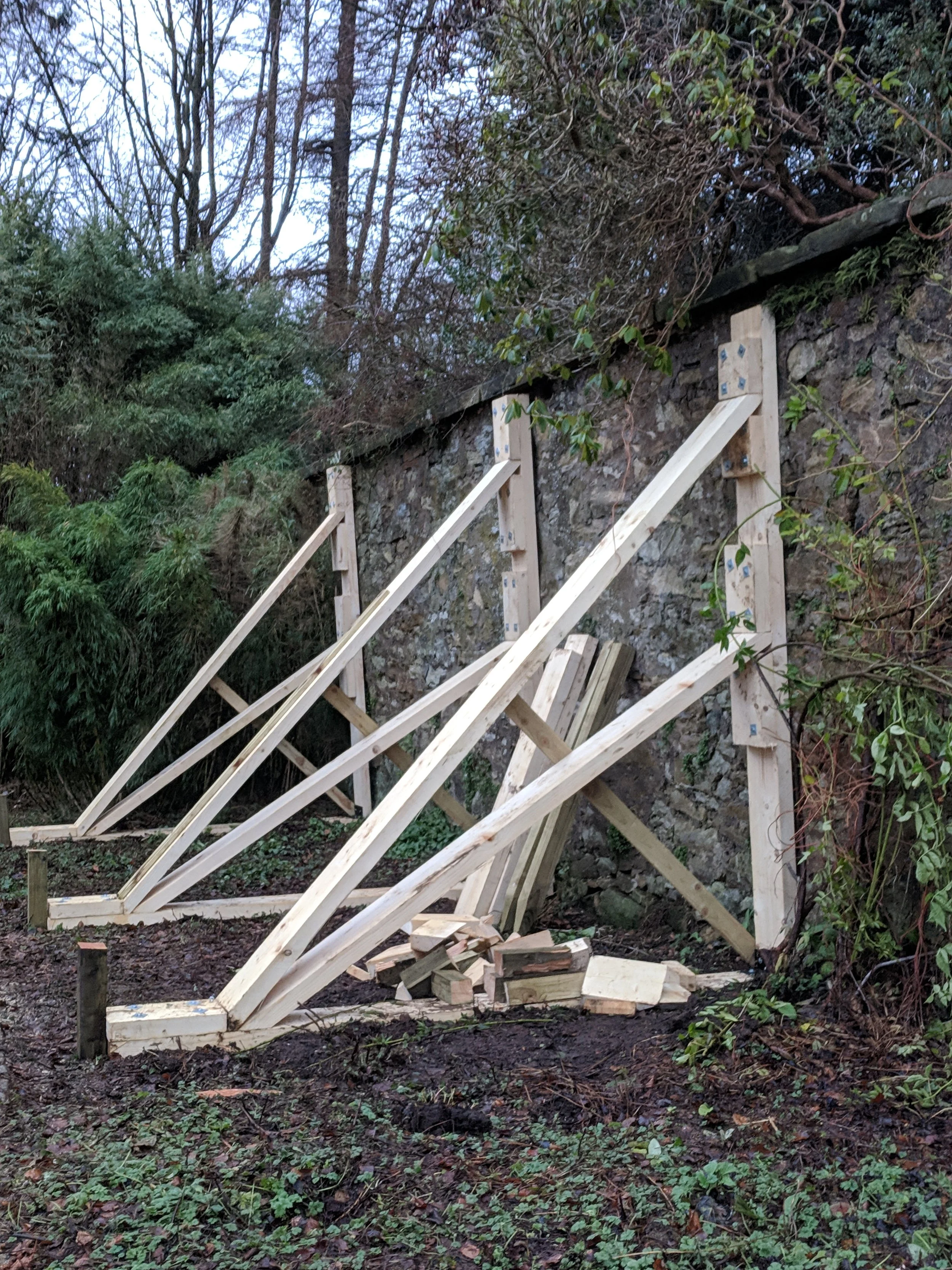 Control of vegetation is essential. Ivy should be carefully removed, and tree roots monitored or redirected. In some cases, root barriers may be necessary to protect the wall’s foundation. Where the vegetation is itself of historic importance, for example in a designed landscape, or protected by other means, cradles can sometimes be formed to lift the the plant off of the wall head so pruning or removing the plant is not always needed.